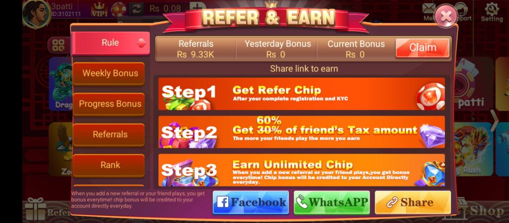 - Upgrade Skills: Improve your skills in Teen Patti and Poker to increase win rates.